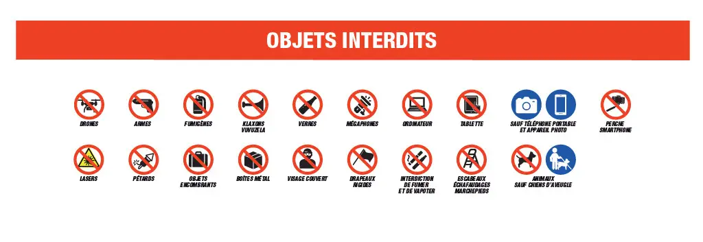 Oui, certains objets sont interdits sur le site. Vous retrouverez la liste des objets interdits sous forme de pictogramme ci dessus et sur votre billet.